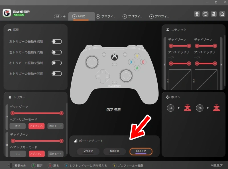 例えば、スティックのデッドゾーンやスティックの曲線、トリガーのデッドゾーン、振動の強さまで調整できます。さらにポーリングレートも250/500/1000Hzから選べるようになります。